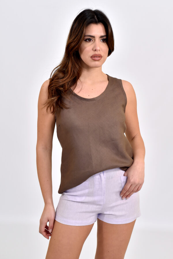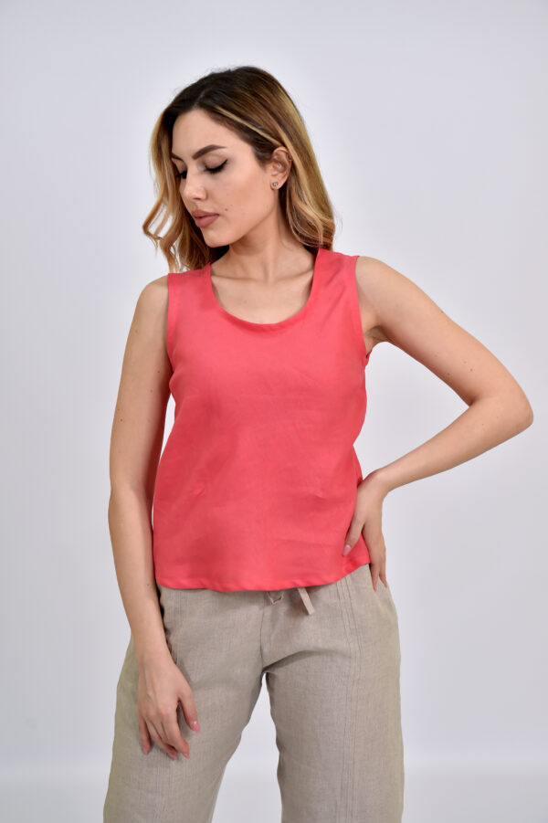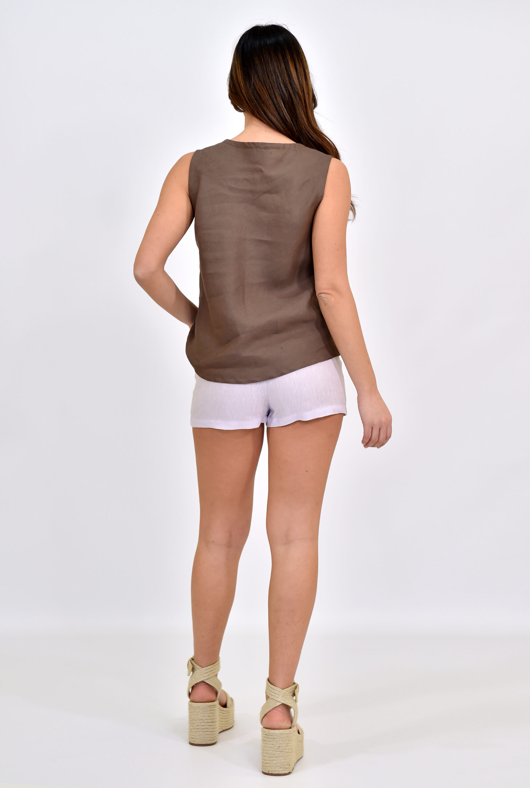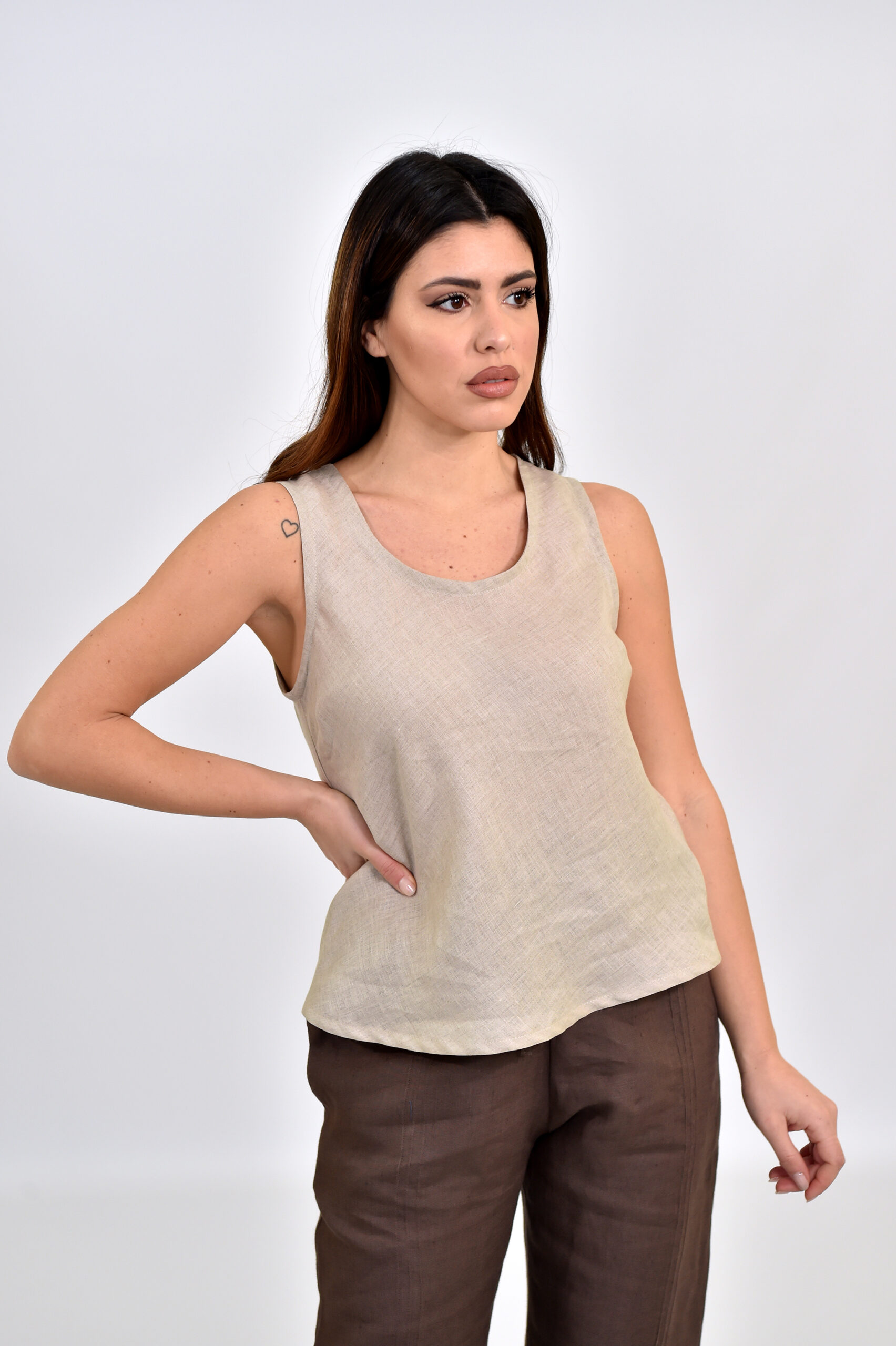 Canotta con spalla larga e riprese seno. Taglio a sbieco.