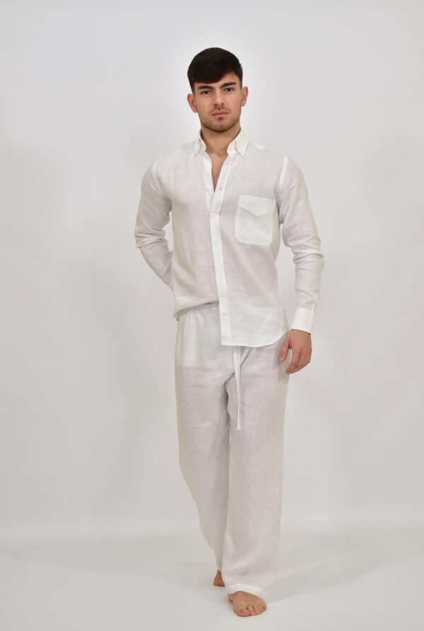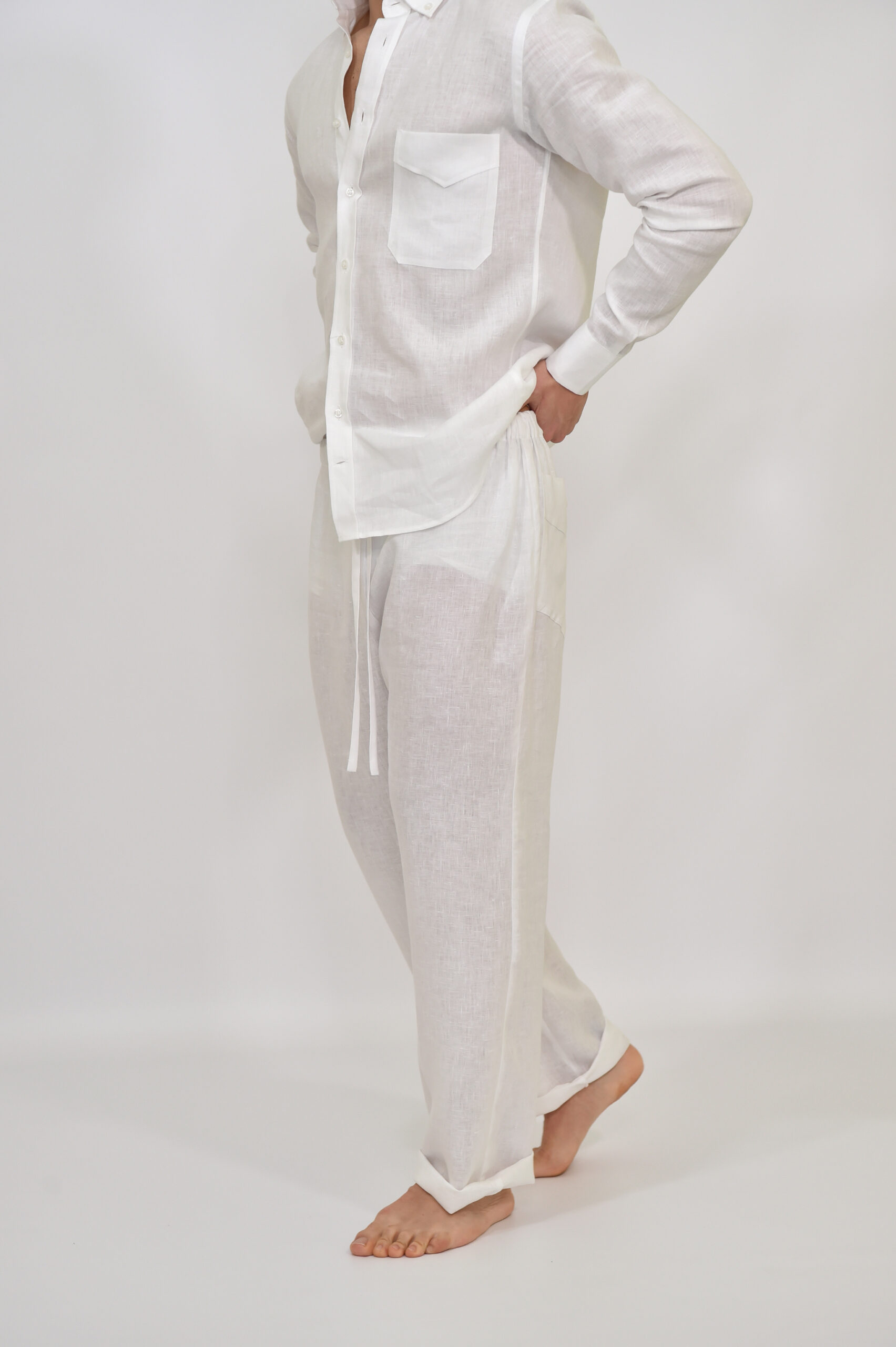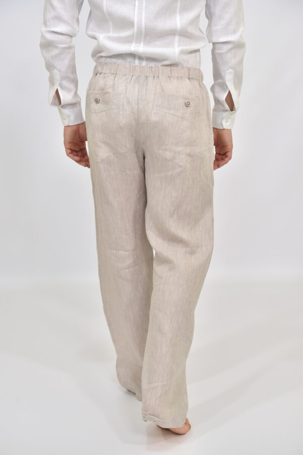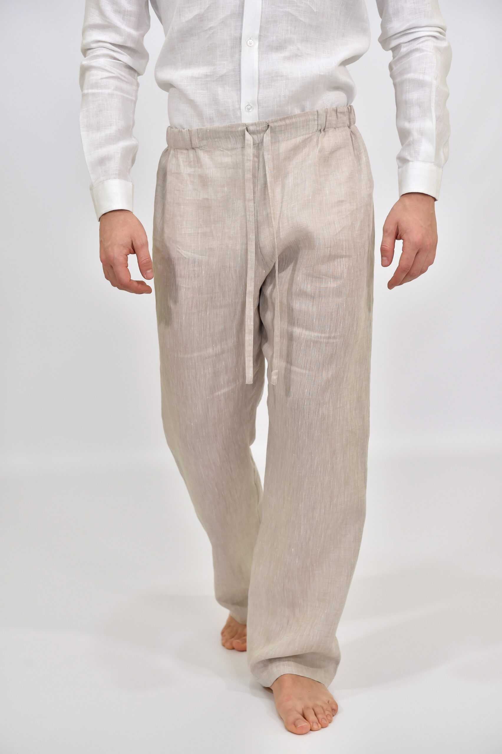 Chiusura con laccio in 100% lino. Punto vita elasticizzato.